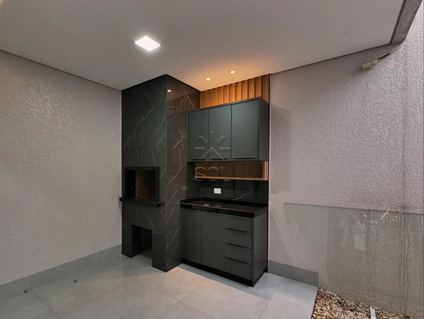 Com móveis embutidos e pedras nos banheiros, cozinha e churrasqueira;