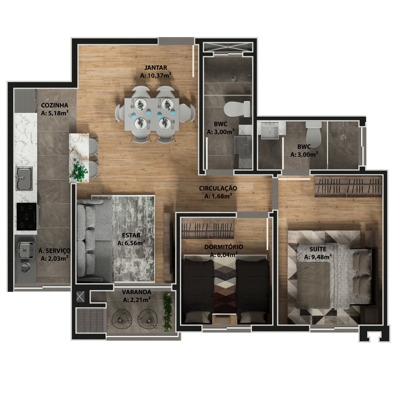Tipo A com Área Total de 89,92m² e Área Privativa: 64,69 m²