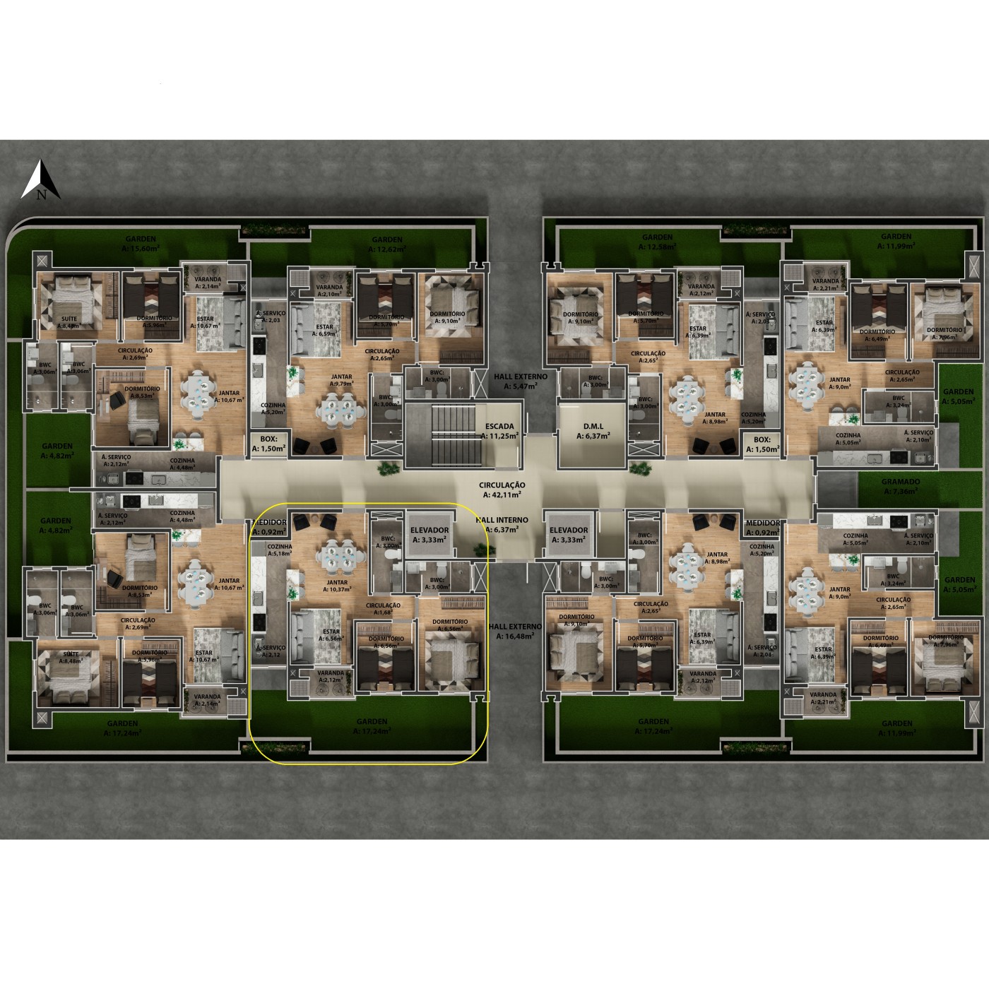 Tipo C com Área Total: 97,70m², Área Privativa: 71,17 m²