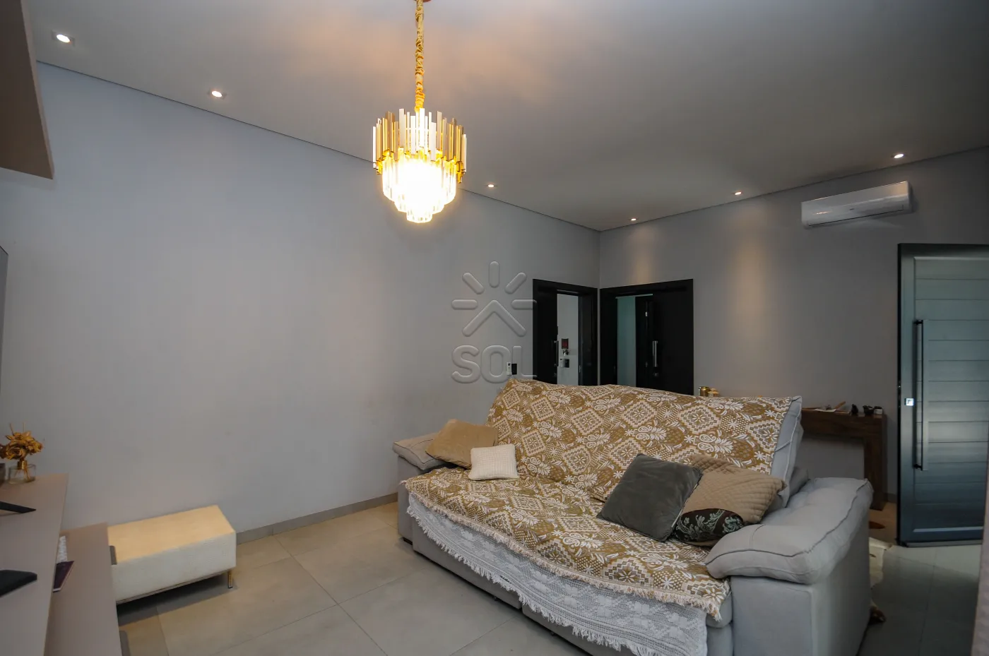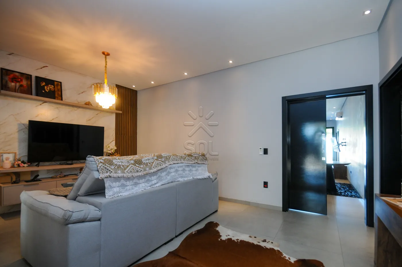 - Sala de estar com painel em porcelanato, home sob medida e lustre;