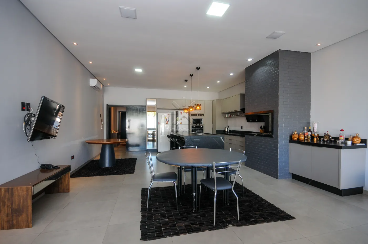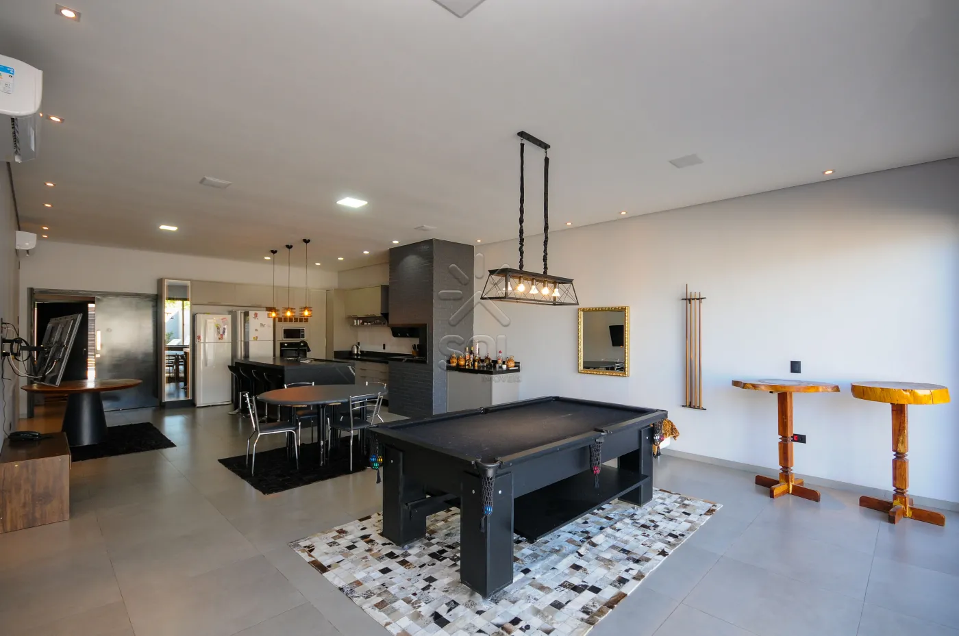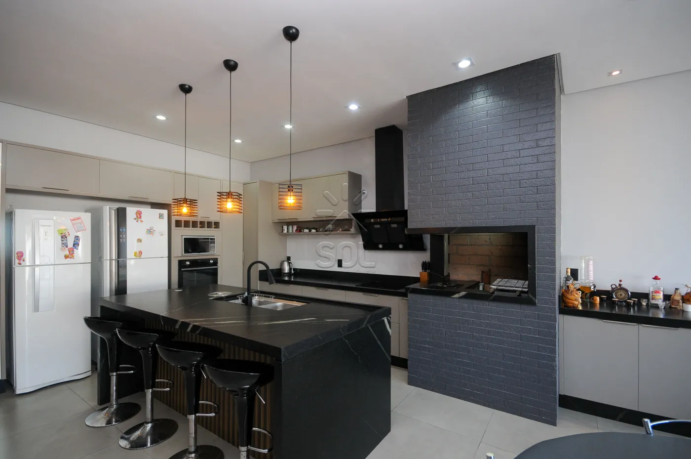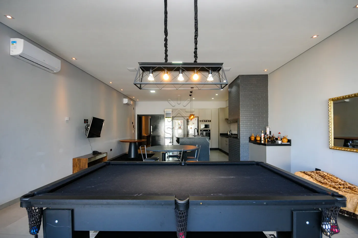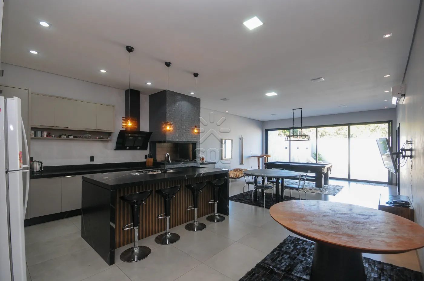 - Cozinha com bancada em granito de alto padrão e móveis planejados, integrada com a área gourmet com churrasqueira revestida em porcelanato e granito, com fogão de alta pressão, som ambiente instalado/wi-fi (4 caixas JBL no teto), mesa de sinuca, espaço para mesas e sofás, com linda visão para piscina;