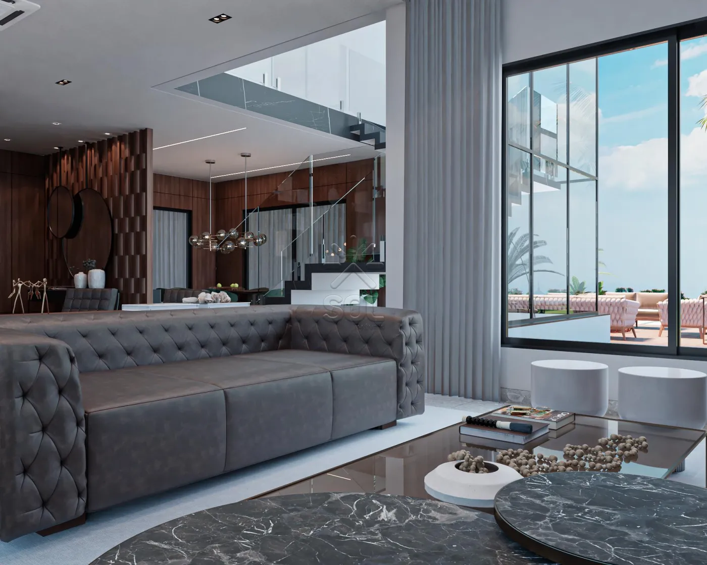 - Área gourmet com armários, espaço para mesa de jantar e estar com ampla abertura e vista para o solário e piscina;
