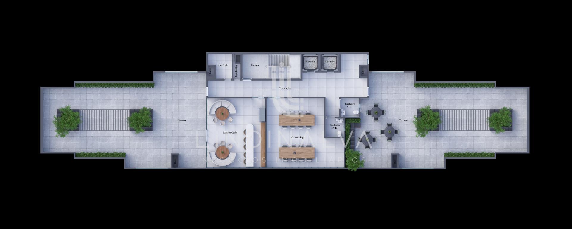 - Áreas verdes e paisagismo em pontos estratégicos, criando conforto visual e conexão com a natureza;