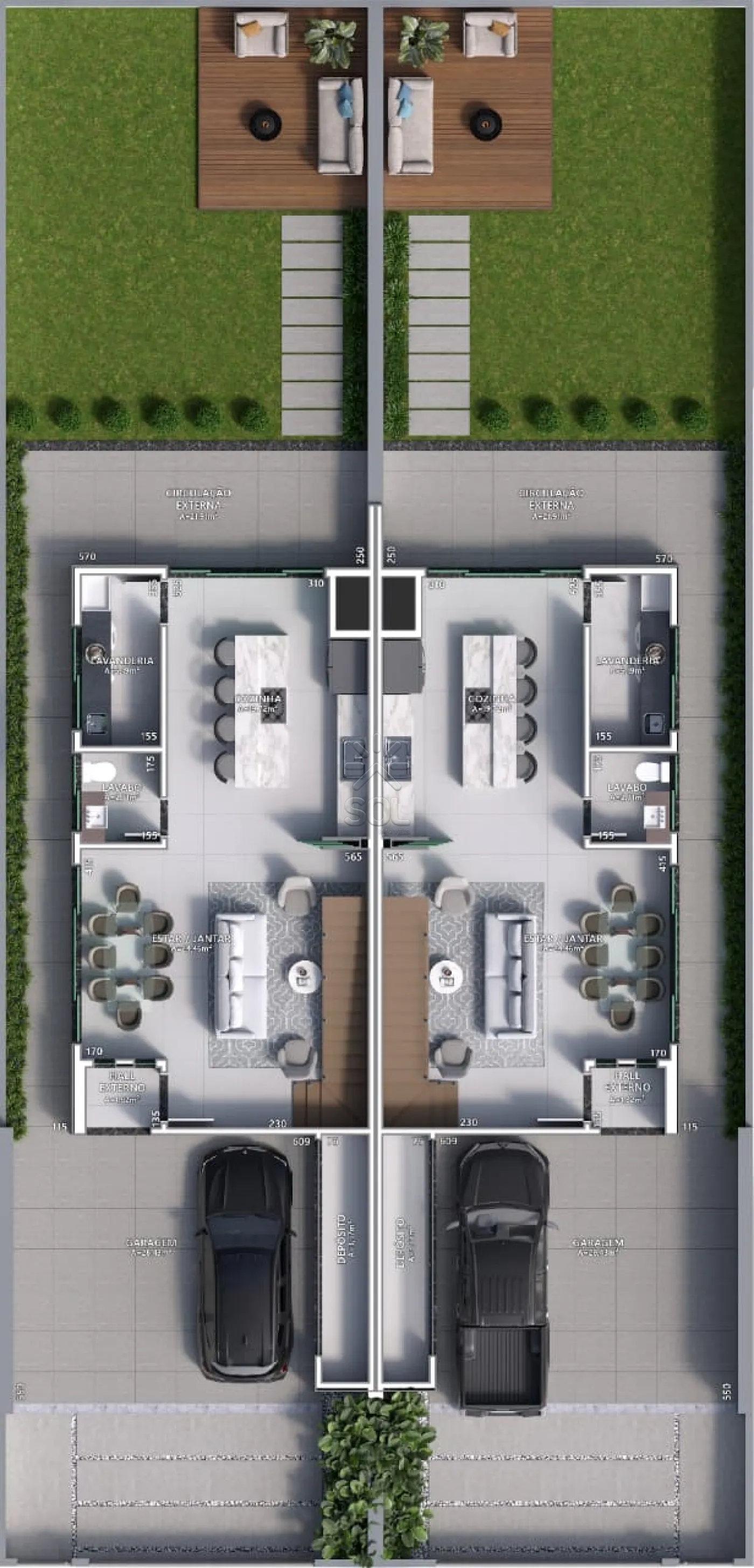 Com 190,99m² de área construída em um terreno de 229,30m², o imóvel conta com uma planta moderna e funcional: