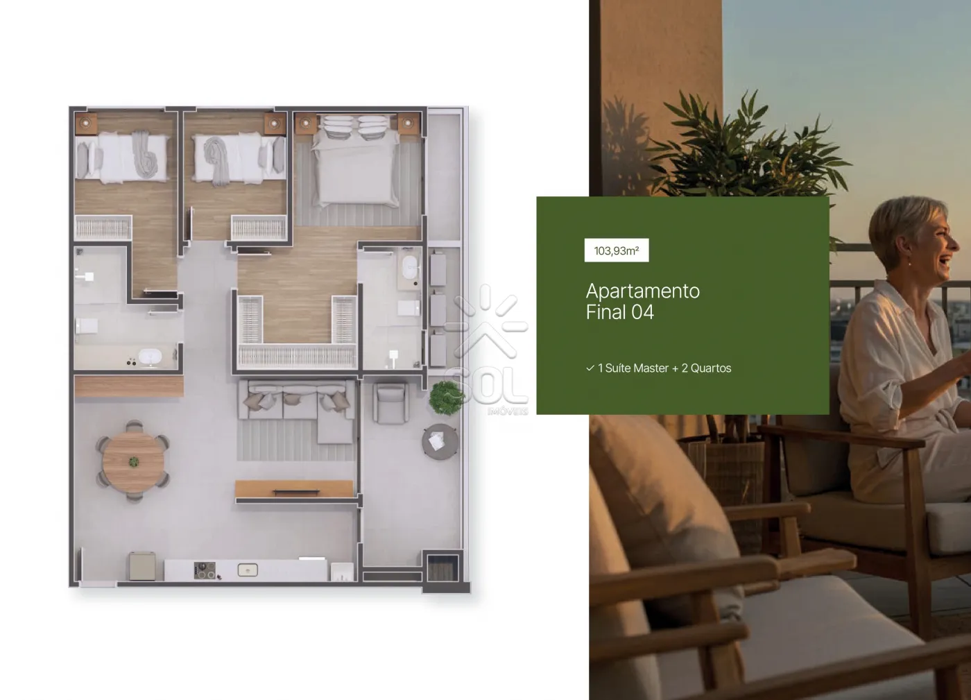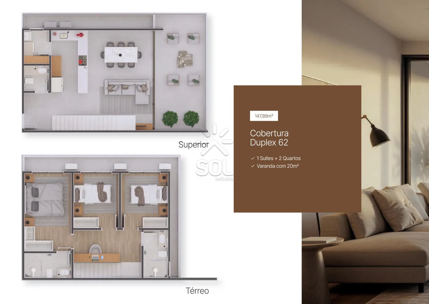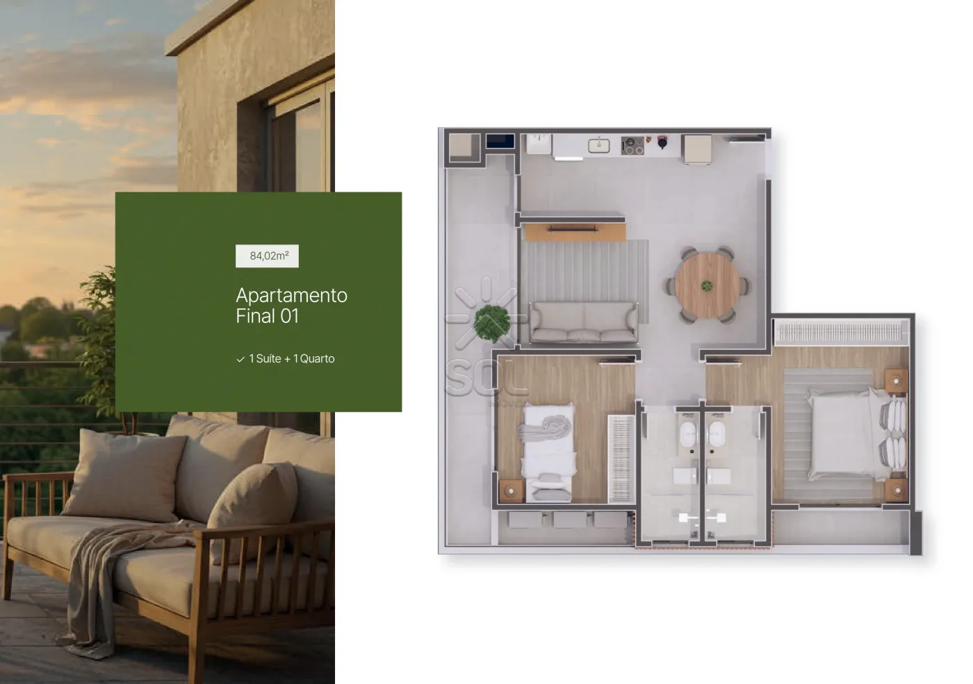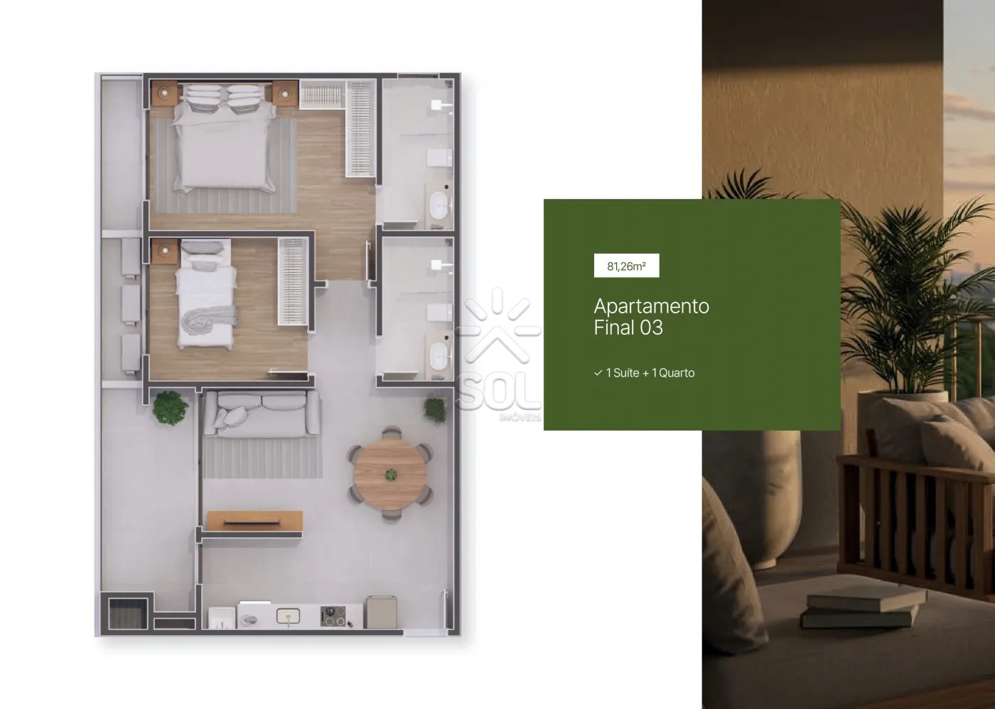 - Composto por 1 suíte, sala para 2 ambientes, cozinha, varanda com churrasqueira e 1 vaga de garagem.