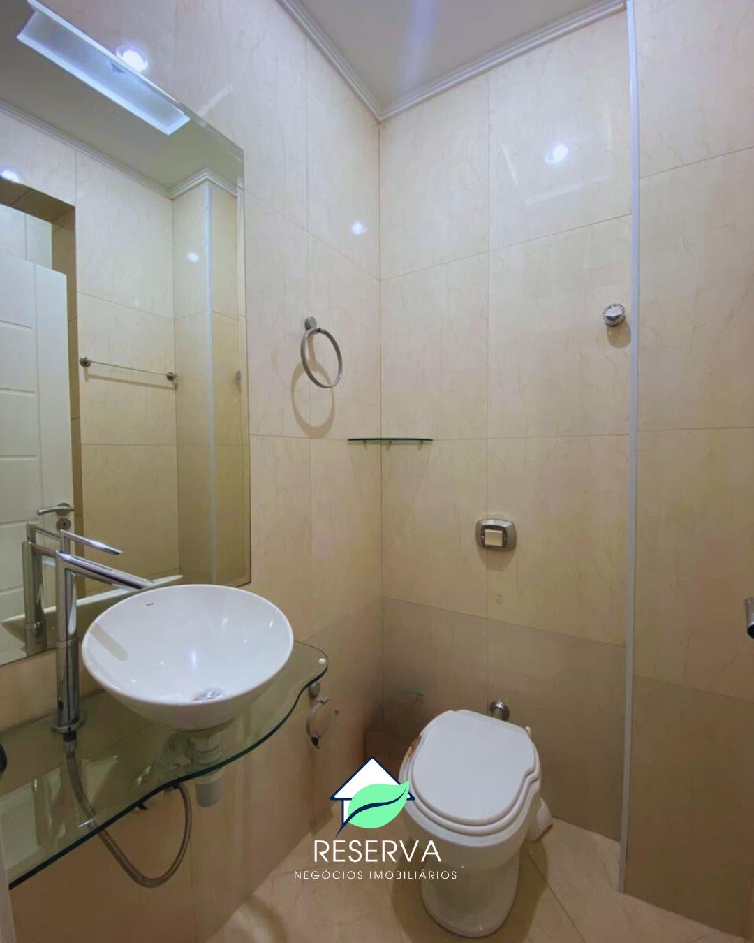 - Banheiro com pia, box de vidro e chuveiro.