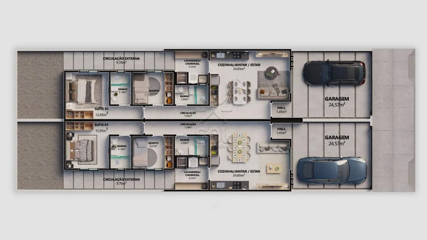 Com 68,39m² de área construída, em um terreno de 125m², a casa é bem distribuída e oferece ambientes modernos e funcionais.